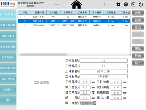 李榮團隊開發(fā)了一套激光焊接裝備數(shù)字化控制系統(tǒng)人機界面軟件,對于提升設(shè)備整體的穩(wěn)定性和信息化程度意義重大。該軟件基于QT平臺使用C++語言編寫,在工控機運行顯示,通過外接鍵盤來輸入?yún)?shù),手動或者自動執(zhí)行焊接操作。具備生產(chǎn)信息、生產(chǎn)數(shù)據(jù)監(jiān)控、參數(shù)設(shè)置、歷史數(shù)據(jù)追溯及數(shù)據(jù)處理、報警及維護、監(jiān)控顯示、信息化看板等主要功能模塊。基于MYSQL建立工藝數(shù)據(jù)庫,工藝數(shù)據(jù)與工件信息和操作人員相匹配,實現(xiàn)信息的存儲、分類整理和統(tǒng)計分析,并能夠?qū)崿F(xiàn)與上層企業(yè)信息管理系統(tǒng)的互聯(lián)互通,企業(yè)可隨時導(dǎo)出需要的生產(chǎn)數(shù)據(jù),方便企業(yè)進行生產(chǎn)規(guī)劃、生產(chǎn)進度管理和產(chǎn)品質(zhì)量追溯,推動企業(yè)向數(shù)字化工廠發(fā)展。